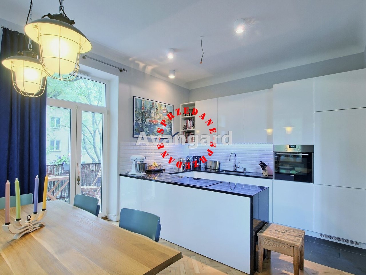 Wszelkie zabudowy wykonane na wymiar. W kuchni duża ilość szafek, dobre sprzęty AGD. Granitowy blat nadający wnętrzu elegancji. Ściany gładź gipsowa – malowane w neutralnym kolorze. Podłoga – oryginalny parkiet po cyklinowaniu. Wysokie sufity!