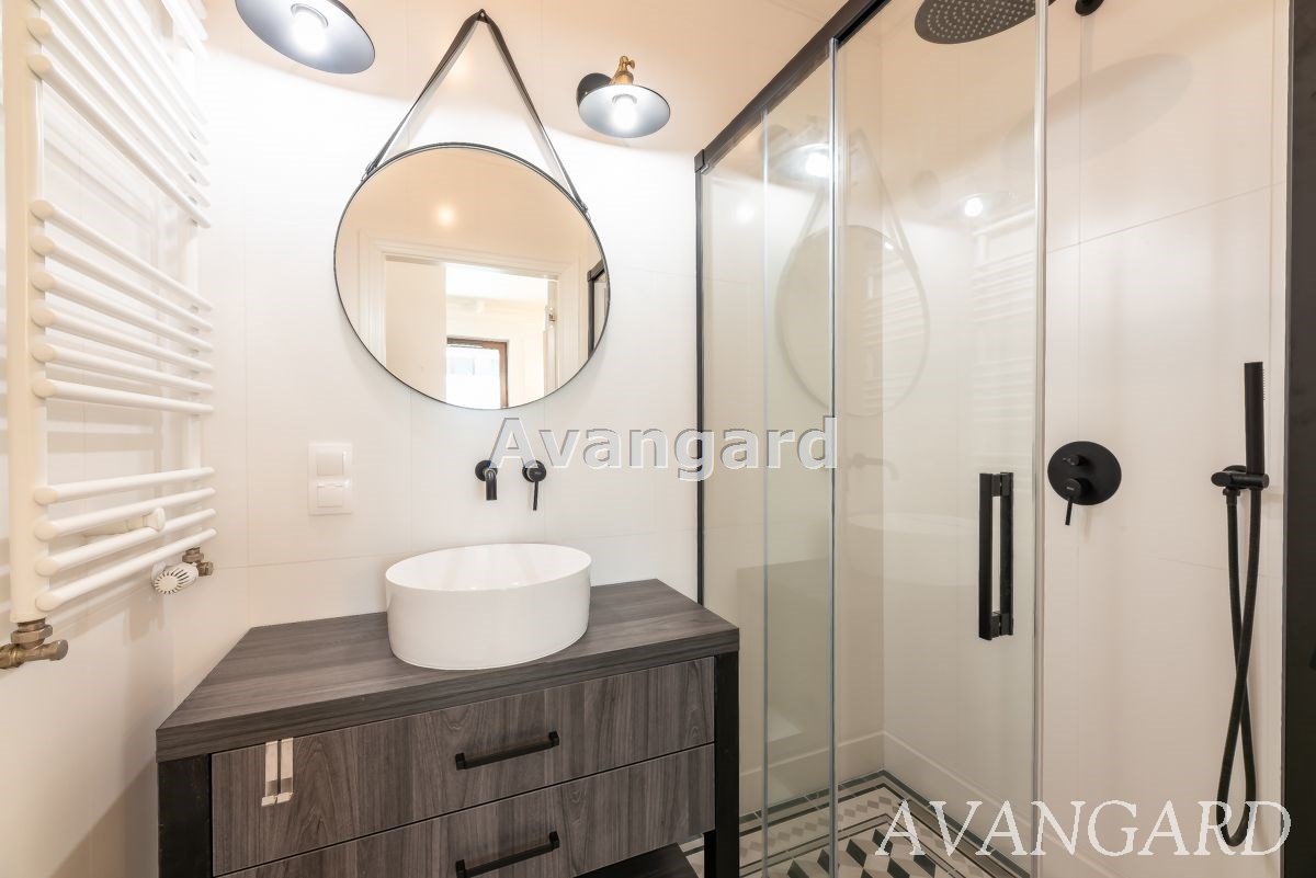 Łazienka z prysznicem (jest deszczownica), zabudową pod umywalkową i dodatkowymi szafkami.