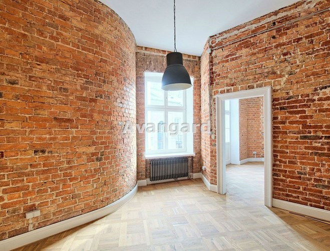 Ściany - oryginalne surowe cegły, na podłodze piękny parkiet.