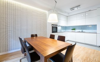 Z salonu i jadalni wyjście na dużą loggię. Salon przestronny, częściowo wyposażony, zmieści dużą i wygodną sofę. Jadalnia umeblowana ( stół, krzesła, oświetlenie). W tle efektowna dekoracyjna ściana. Kuchnia – nowoczesna zabudowa z pełnym wyposażeniem AGD.