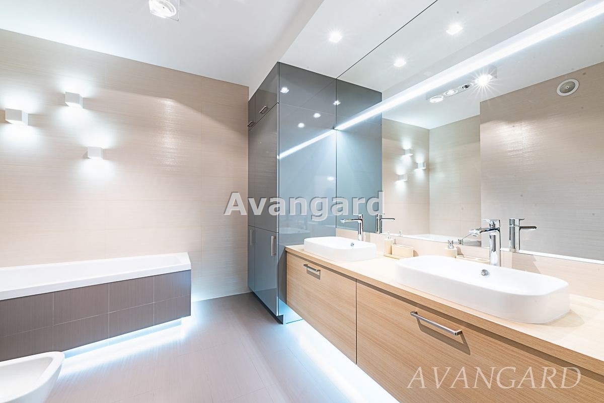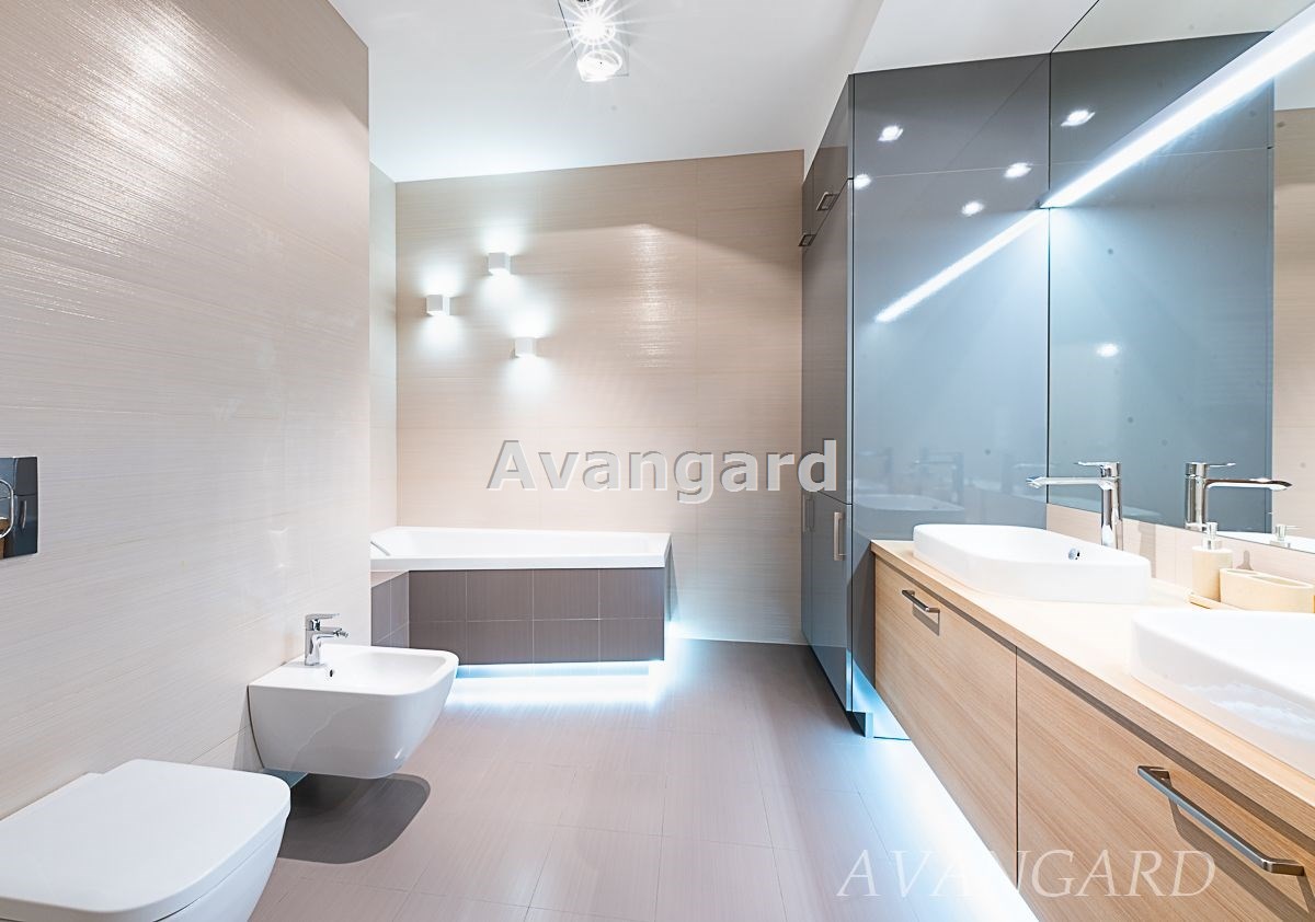 Większa łazienka z wanną, bidetem, podwójną umywalką.